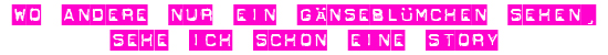„Miss Butterfly“ (Jahrgang 1970) kann man nicht einfangen, sie fliegt einem ausschließlich zu. Es gibt kaum jemanden, der nicht lächeln müsste, wenn sie sich auf seinem Arm niederlässt. Sie ist gerne im richtigen Moment am richtigen Ort. Wenn sie es wünscht, bleibt ihr nichts verborgen. Mit zarten Flügelschlägen verbreitet sie ihr Statement nachhaltig: „Ich suche keine Schlagzeilen, sie begegnen mir sowieso!” Auf den ersten Blick ist dieses Fräulein Schmetterling einer Blume gleich, die fliegen kann. Augenfällig schillernd. Als feature writer, trendscout, und networker ist sie Papillon-üblich extrem wandelbar – mit Vorliebe bissig und biestig, hart am Puls der Zeit. Aber Keine Angst! Behandelt man sie gut, bleibt sie ungefährlich!